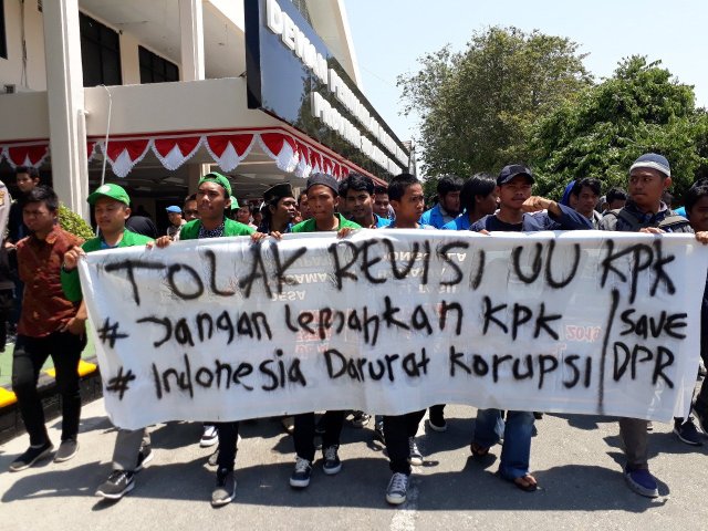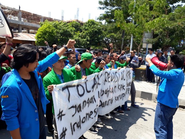Aliansi Mahasiswa Kota Palu menuntut: revisi UU No. 30 Tahun 2002 tentang Pemberantasan Tindak Pidana Korupsi dan memilih secara objektif pimpinan KPK. Aliansi Mahasiswa Kota Palu dipersilahkan masuk ke ruang persidangan gedung DPRD Provinsi Sulawesi Tengah untuk menyampaikan aspirasinya secara langsung kepada anggota komisi IV DPRD.