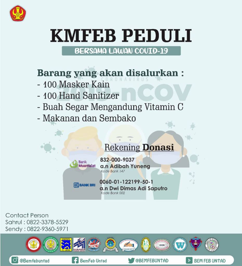 (20/04/2020). Keluarga Mahasiswa Fakultas Ekonomi dan Bisnis (KMFEB) Universitas Tadulako, Mengadakan kegiatan bakti sosial dengan tema “Demi keberlangsungan ekonomi rakyat dan perlawanan terhadap Covid-19”. Hal ini dilakukan tentunya untuk membantu masyarakat kalangan ekonomi menengah kebawah dalam memerangi pandemik covid-19. Adapun dalam pengadaan bakti sosial ini dibersamai oleh Himpunan Mahasiswa Islam Indonesia (HMI) komisariat FEB Untad dan Juga Golden Retriever (Komunitas musik) kota Palu.