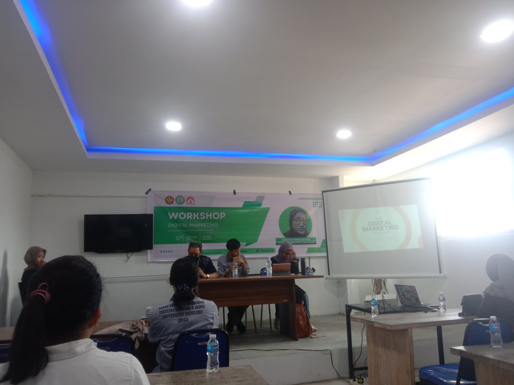 “Workshop kali ini menarik dengan tema Workshop Digital Marketing. Era sekarang ini, tidak bisa lagi melakukan pemasaran secara konvensional, kita harus masuk ke dunia digital. Dan jadikan dunia digital saat ini sebagai peluang. Kalau ingin bergerak, kuliah sambil berbisnis juga itu lebih baik. Dengan pemasaran digital, strategi pemasaran digital kita semua bisa melakukan bisnis dengan menggunakan alat-alat digitalisasi seperti handphone. walaupun kita berada di rumah, bisnis kita akan tetap jalan sebab teknik marketingnya sudah digital. Dengan mencoba melakukan usaha, kita akan mengurangi beban orang tua dalam hal perkuliahan,” sambutan dari Wadek.