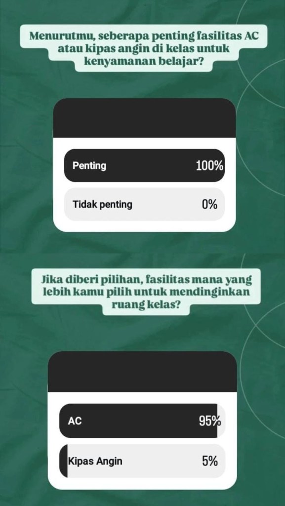 Seorang mahasiswa jurusan Manajemen, mengungkapkan preferensinya. Ia mengakui bahwa pilihan penggunaan AC atau kipas angin sangat bergantung pada kondisi infrastruktur kampus saat ini. “Karena masih dalam tahap renovasi, banyak kelas yang belum dilengkapi AC. Jadi, kita harus menyesuaikan diri dengan kondisi yang ada, tapi saya memilih AC” ujarnya.