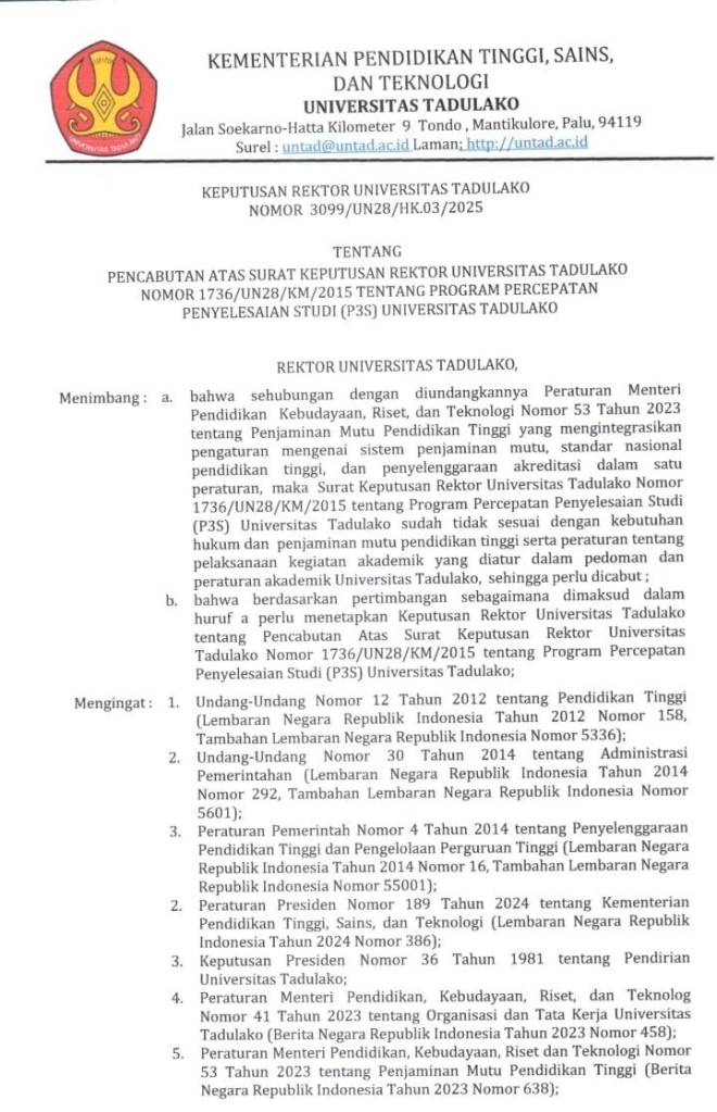Pencabutan ini merujuk pada Surat Keputusan Rektor Universitas Tadulako Nomor: 3099/UN28/HK.03/2025 tentang Pencabutan SK Rektor Nomor: 1736/UN28/KM/2015 tentang Program Percepatan Penyelesaian Studi (P3S) Universitas Tadulako.